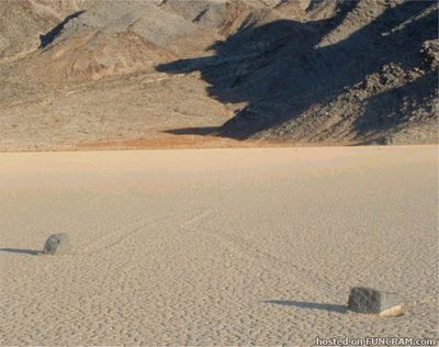 The moving rocks, also known as sliding rocks or sailing stones, are a geological phenomenon found in Racetrack Playa, a seasonally dry lake (a playa) located in the PanamintMountains in Death Valley National Park, California. The rocks move across the surface of the playa, leaving long tracks behind them as they go, without human or animal intervention. They have never been seen or filmed in motion.